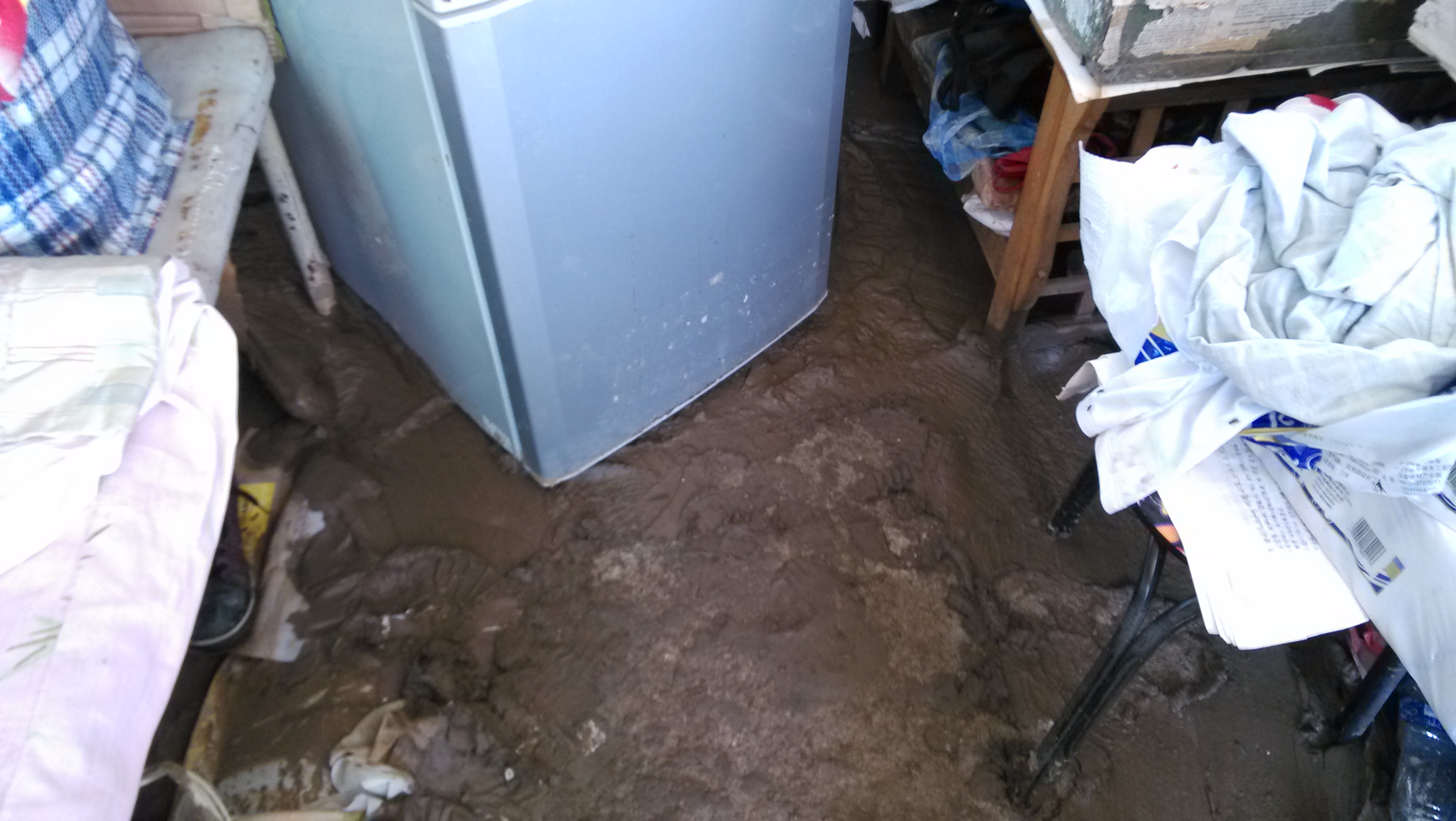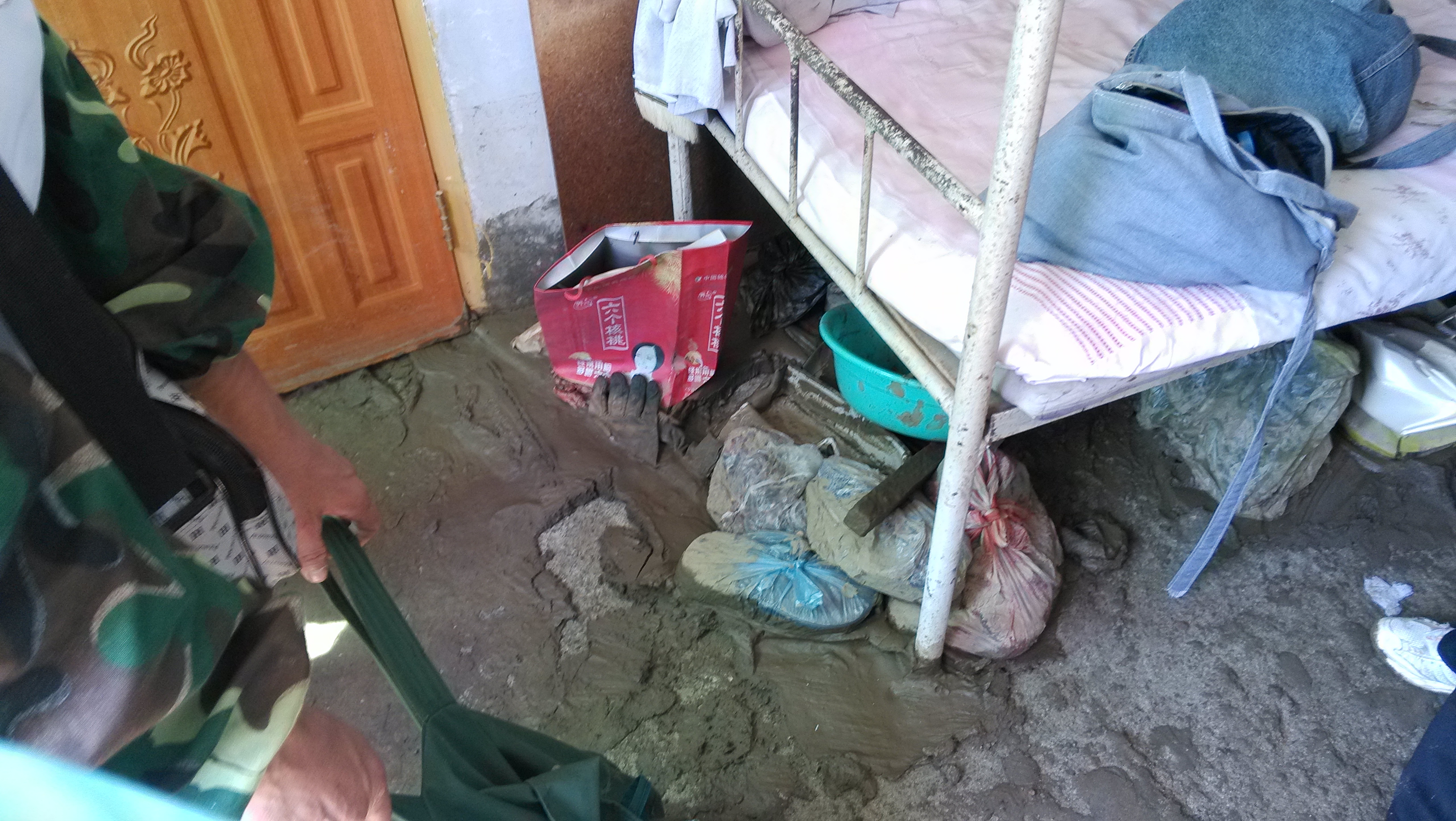 这是法轮功学员的家,住在重灾地段,屋里进水到床铺以下,有一张照片有进水的痕迹。另一张照片床单都没湿,淤泥只有几公分厚。