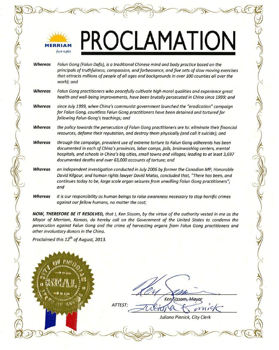因此,我,Ken Sissom,由于德行而荣任美国堪萨斯州Merriam市的市长,特此呼吁美国政府谴责中国对法轮功的迫害,谴责活摘法轮功学员器官和其它非自愿捐助器官的罪行。