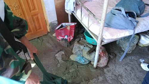 ![]() 住在重灾地段的法轮功学员屋中进水只到床铺以下 |