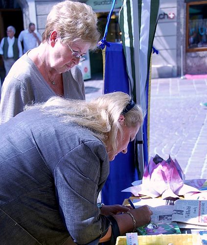 Ridky 女士来自德国的纽伦堡,在和她先生在征签表格上签字后,看到法轮功传单上的“真、善、忍”三个字后,表示,法轮功学员按照这个为标准生活,他们的器官绝对是健康的。她还说:“中共的媒体说谎话和造谣,这已经很有名了,不是什么新鲜事情,但是活体摘取器官,简直是太可怕了。”
