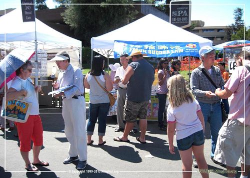 二零一三年八月三日和四日,美国旧金山湾区的部份法轮功学员在佛利蒙市中心举行的艺术节上举办征签活动,要求中共停止活体摘取法轮功学员器官的暴行。