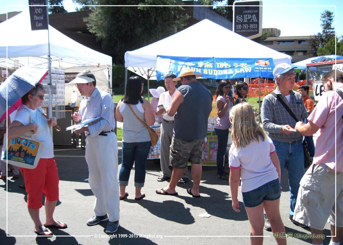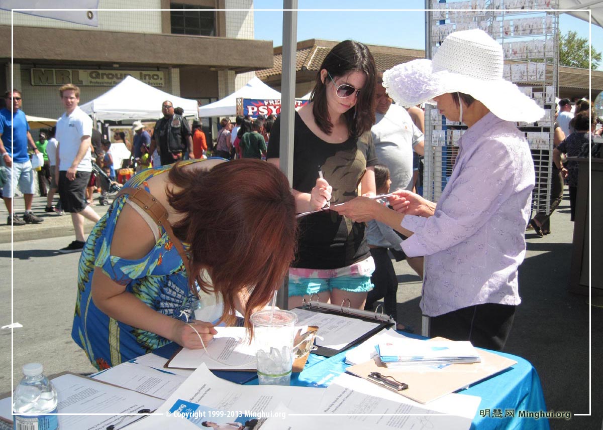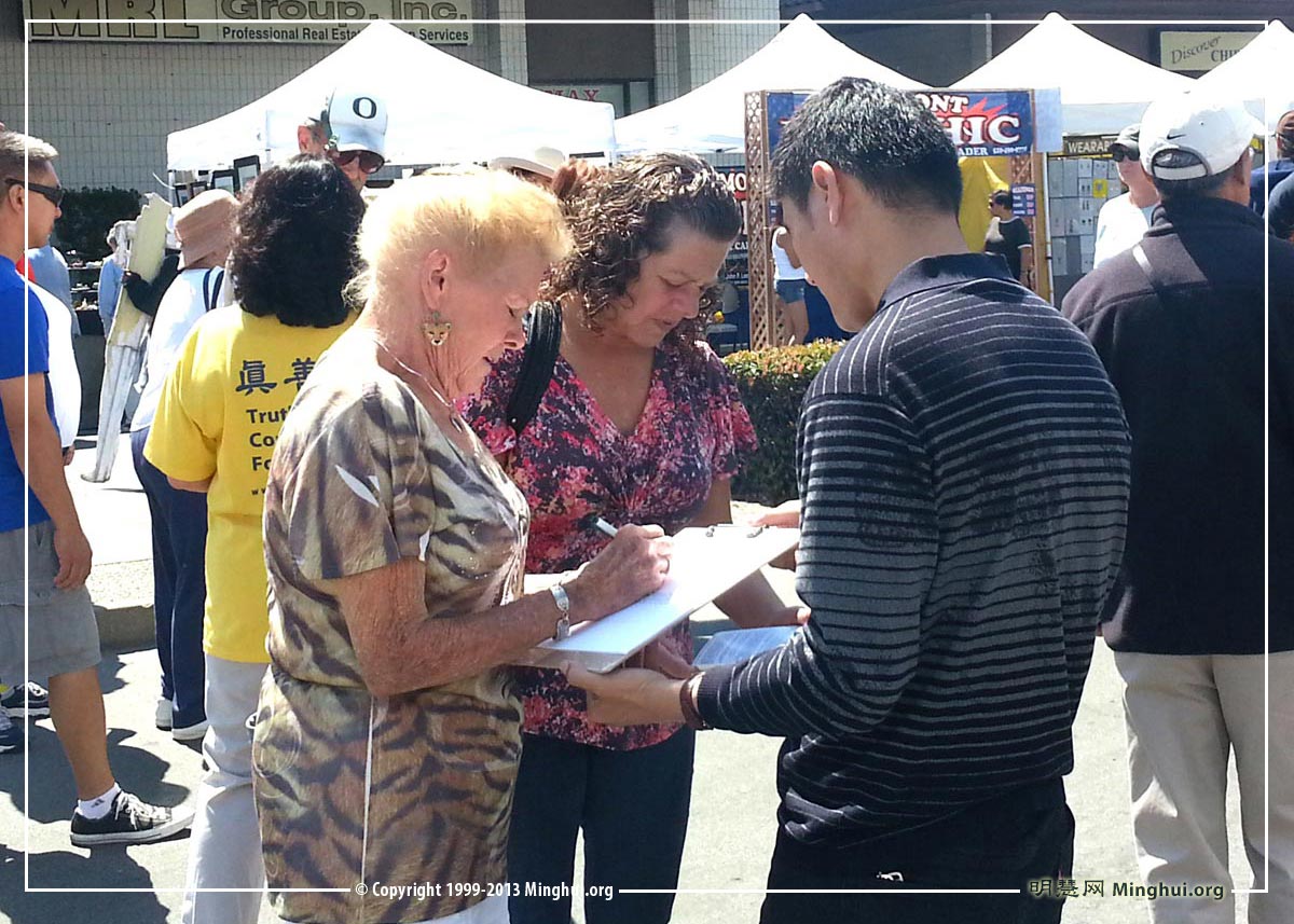 另一位佛利蒙市居民朱迪思·麦克琳蒂(Judith McLrinty)径直走到法轮功学员的摊位要求签名。她说:“我知道在中国发生的对法轮功的迫害。十年前我就知道了。迫害是不对的。中共对中国人非常残酷。应该让更多的人知道。我支持你们的行动。”