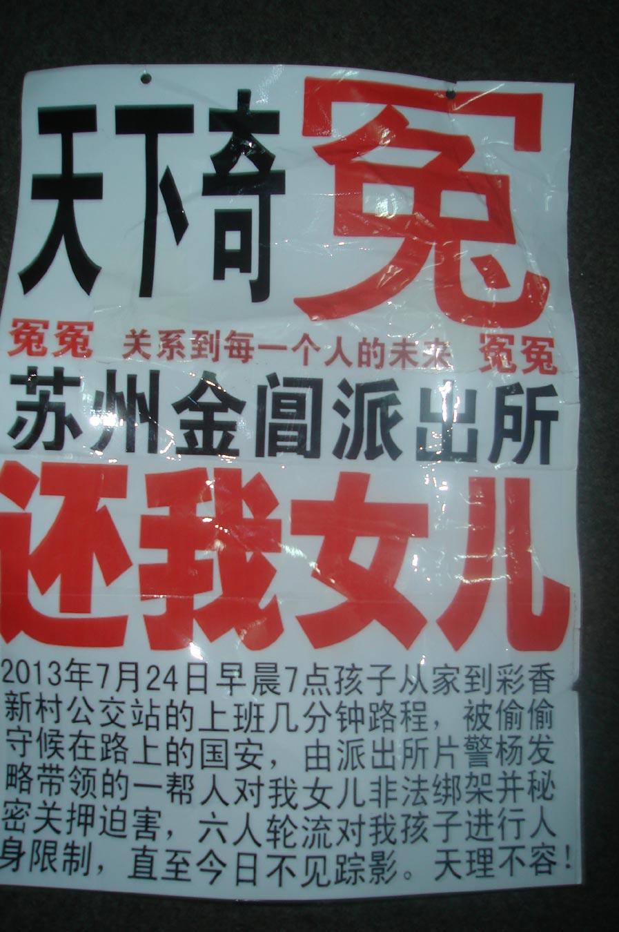 路燕父母不畏强暴,紧接着2013年8月4日周日上午9点整又从新挂上了“天下奇冤”牌子,堂堂正正的站在苏州金阊派出所的大门口,这时陆平 警号 042869(主任),拿着照相机走到了路通跟前对着路通咔嚓咔嚓的拍个不停,陆平边拍边说你不是有冤吗,我来帮你“宣传宣传”……