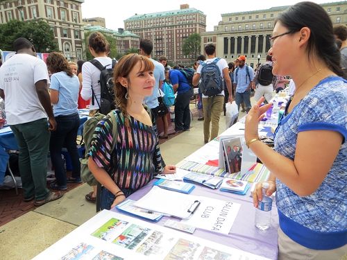 一部份学生感到非常吃惊但又很好奇,想不到在哥大校园中心会有学生俱乐部介绍法轮大法。他们比较愿意和学员交谈,好几位学生拍下桌上的法轮大法真相传单以做纪念。有一位学生觉得机会难得,特意站在介绍法轮大法的展板前留影。
