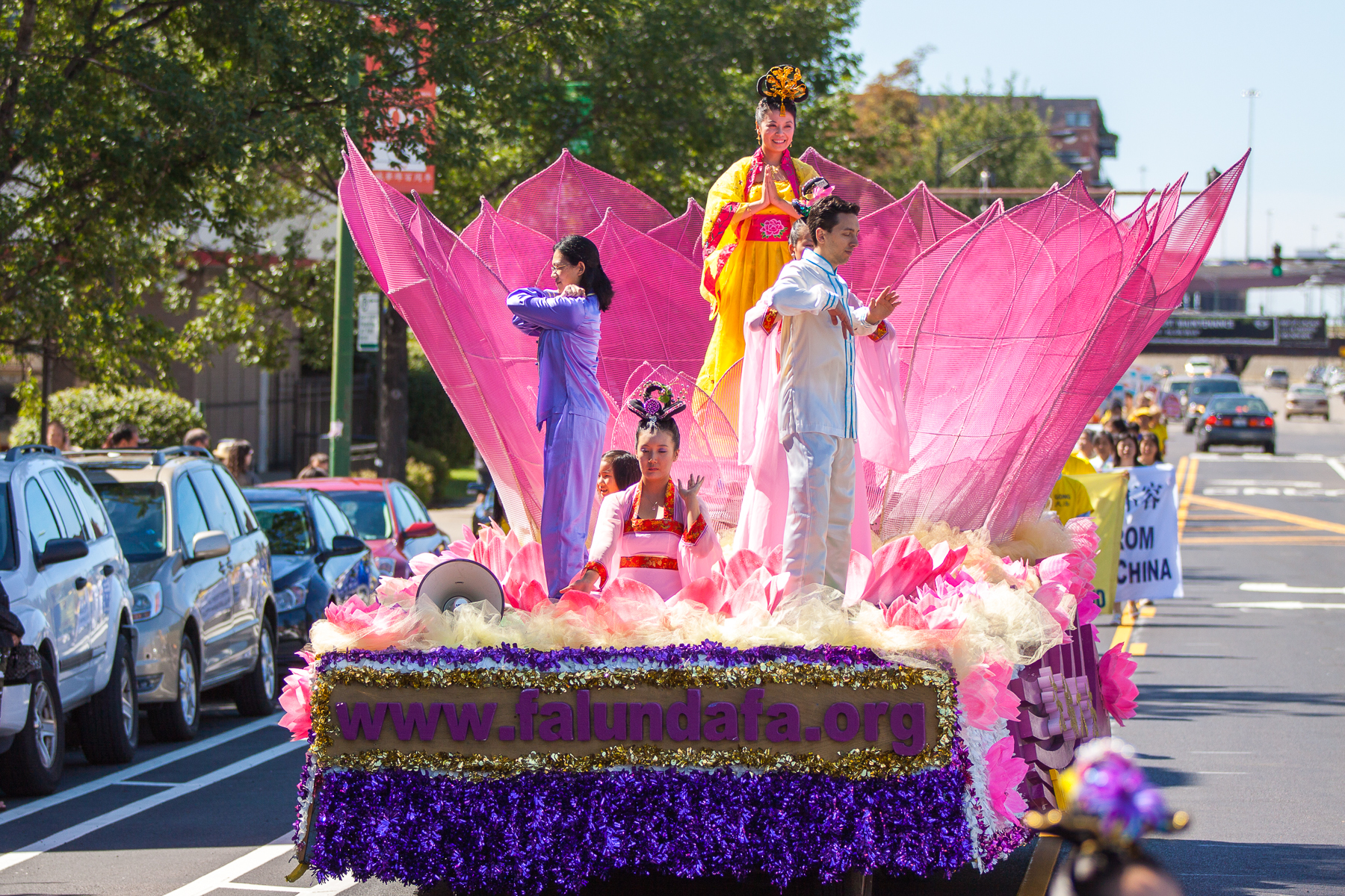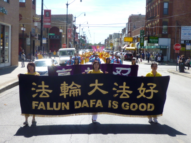 十四日中午,在芝加哥警方的开道引路下,法轮功游行由旗队和功法演示花车打头阵;腰鼓队紧随其后;并由反迫害和退党方阵压轴,从南华埠永活街南端出发,一路向北,经过“天下为公”牌楼后西行,再取道“亚珠”街,经过华埠广场,最后再返回永活街。