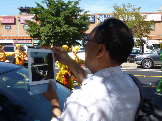 ![]() 华人人用I-Pad记录法轮功游行的震撼场景。 |