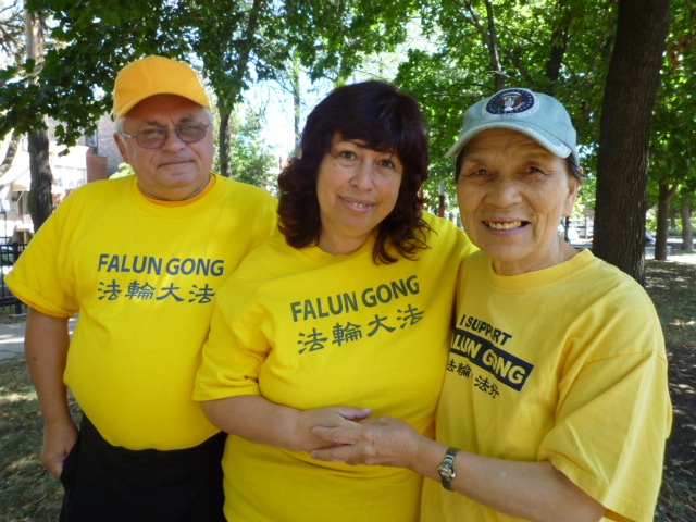 ![]() 西人法轮功学员玛丽娜(中)和乔治(左)与华人法轮功学员在一起 |