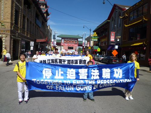 十四日中午,在芝加哥警方的开道引路下,法轮功游行由旗队和功法演示花车打头阵;腰鼓队紧随其后;并由反迫害和退党方阵压轴,从南华埠永活街南端出发,一路向北,经过“天下为公”牌楼后西行,再取道“亚珠”街,经过华埠广场,最后再返回永活街。