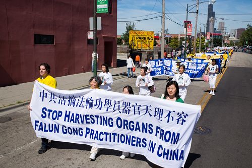 【明慧网二零一三年九月十五日】(明慧记者杨文玉芝加哥采访报导)二零一三年九月十四日,芝加哥晴空万里、秋高气爽,美中法轮功(又称法轮大法)学员陆续抵达芝城南华埠,中午十二点,声势浩大的“讲真相、反迫害、促三退”游行正式展开。这是美中法轮大法学会主办的每年一度的大型活动。除游行外,还将于次日举办修炼心得交流会。