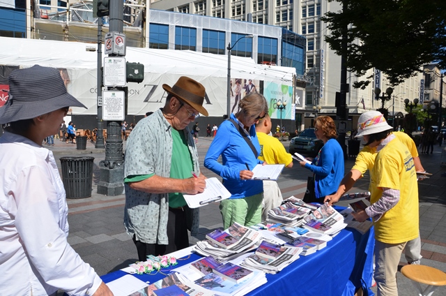 在短短不到四小时的时间,征签活动就征集近一千个签名,过去六个星期西雅图法轮功学员已征集超过一万五千个签名支持281决议案。