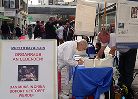 二零一三年九月十四日,在瑞士温特图尔市的步行街,法轮功学员挂出的中共迫害法轮功学员的案例照片以及征签的大幅展板,让很多路人驻足了解更多的讯息。有的已经对此有所了解,看到关于中共活摘的讯息后就主动要求签名。