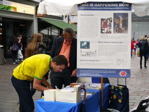 二零一三年九月十四日,这一幕在瑞士温特图尔市(Winterthur)的步行街出现。法轮功学员挂出的中共迫害法轮功学员的案例照片以及征签的大幅展板,让很多路人驻足了解更多的讯息。有的已经对此有所了解,所以看到关于中共活摘的讯息后就主动要求签名。