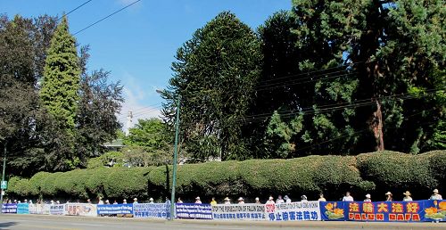 ![]() 温哥华学员在中领馆前拉起真相长城抗议迫害持续 |
