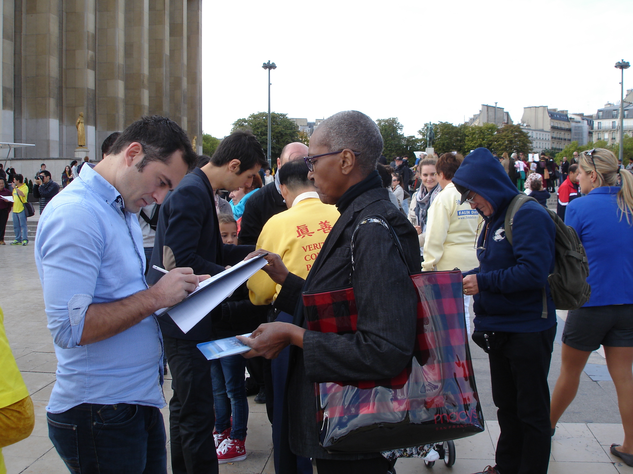 马易嘉力(Maigari )是音乐人士,原籍喀麦隆,他说得一口流利的普通话。他十四岁那年就去中国学习汉语和武术,在那里生活了七年。他对发生在中国的事情很敏感、很关心,但他不知道在中国有活摘人体器官的罪恶。在征签表上签字后,他与法轮功学员握手,感谢法轮功学员让他知道了这一信息。他还索要了一份征签表,要拿回去复印后送给他周围的当记者的朋友,要让更多的人知道这一事实。