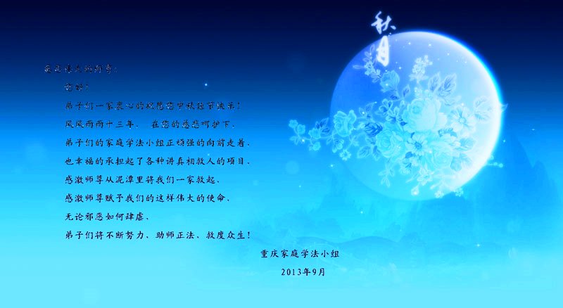 中秋节快到了,我们向慈悲伟大的师尊致以中秋的问候:师尊您辛苦了!我们一定按照师尊要求的,努力做好三件事,在剩下不多的时间内修好自己多救人,圆满随师还。