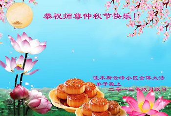 我们庆幸自己能够有如此殊荣,向远隔重洋的李大师恭祝中秋节快乐,向伟大慈悲的李大师献上我们永远的感恩!冥冥之中似乎等待了千万年,直到我们了解了大法的真相,做了“三退”,我们才如梦方醒,从中共邪党蛊惑欺骗的漩涡中跳了出来,原来自己一直以来挣扎于沼泽地中苦苦等待的就是这个!我们明白了怎样做人,怎样生活,心中充满了希望与阳光!我们由衷的感恩李大师!感恩李大师救度了我们!
