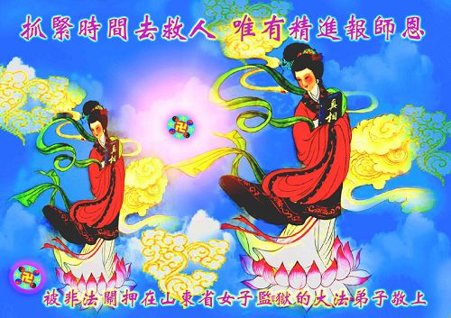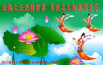 八月十六日,全县都下起了大暴雨,晚十点多钟,外面的水眼瞅着往上涨,孩子爸说:快往后山跑吧!我突然想起法轮功资料上告诉的,危难时,念“法轮大法好”能得救。我跪在炕上,双手抱拳大声说:李大师快救救我们,我们不需要水,“法轮大法好”,“法轮大法好”!我十二岁的女儿也跪着跟着一起念。