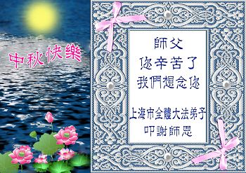 上海市宝山区全体大法弟子敬祝师父中秋节快乐!请师父放心,弟子们一定紧跟正法進程,静心学好法,做好三件事,讲清真相多救人,圆容师父所要的。让师父多一些欣慰,少一分操劳!