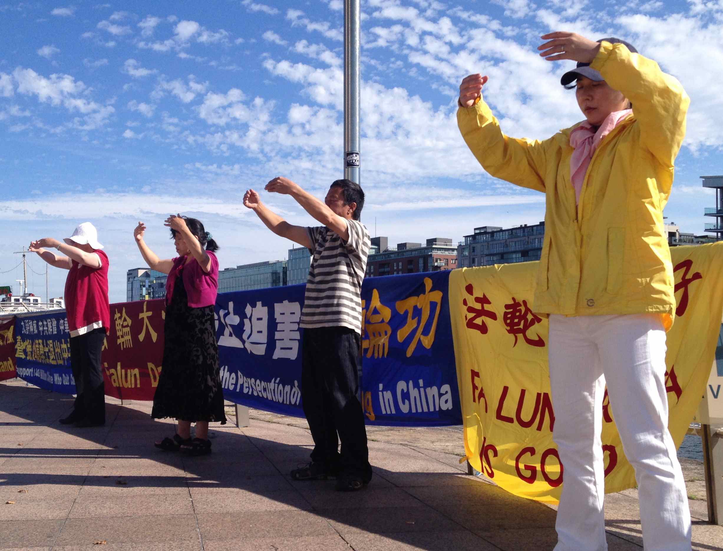 法轮功学员祥和、慈悲的炼功,吸引了很多世界各地的与会人员的注意力和兴趣。很多人过来拿资料、签名支持停止迫害和反对活摘器官。有的甚至想要学炼法轮功。
