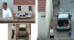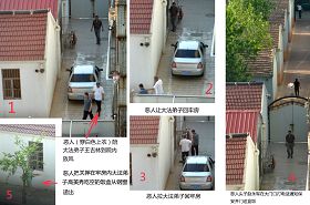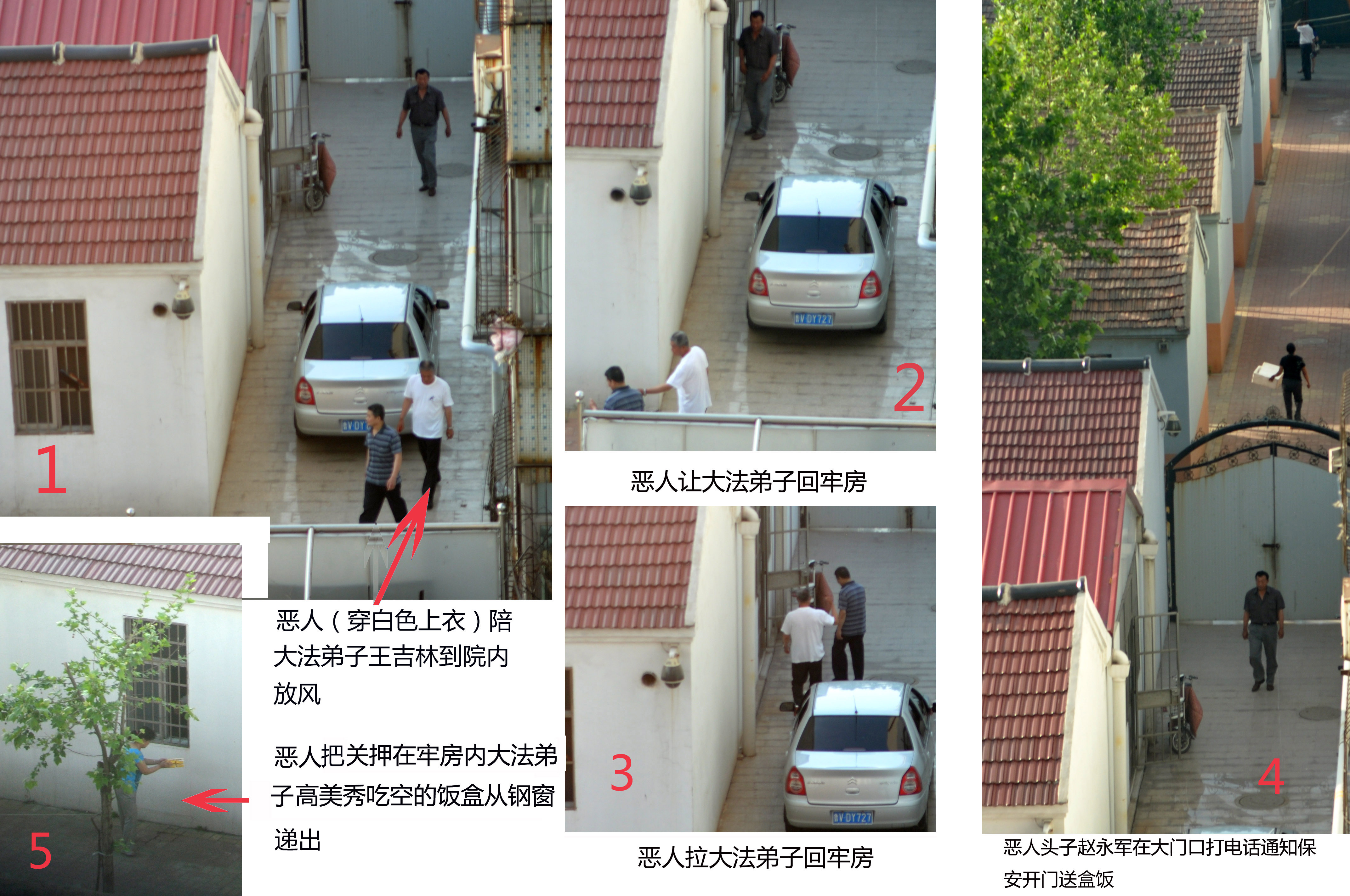 上图中1、2、3是恶人陪潍坊大法弟子王吉林到院内放风 图中4是恶人赵永军在大门外电话通知保安开门送盒饭 图中5是恶人从窗外把关在牢房内潍坊大法弟子高美香吃空的盒饭收走