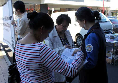 不少民众驻足在真相横幅前仔细观看,在征签表上签名谴责迫害、支持立法制止活摘器官。