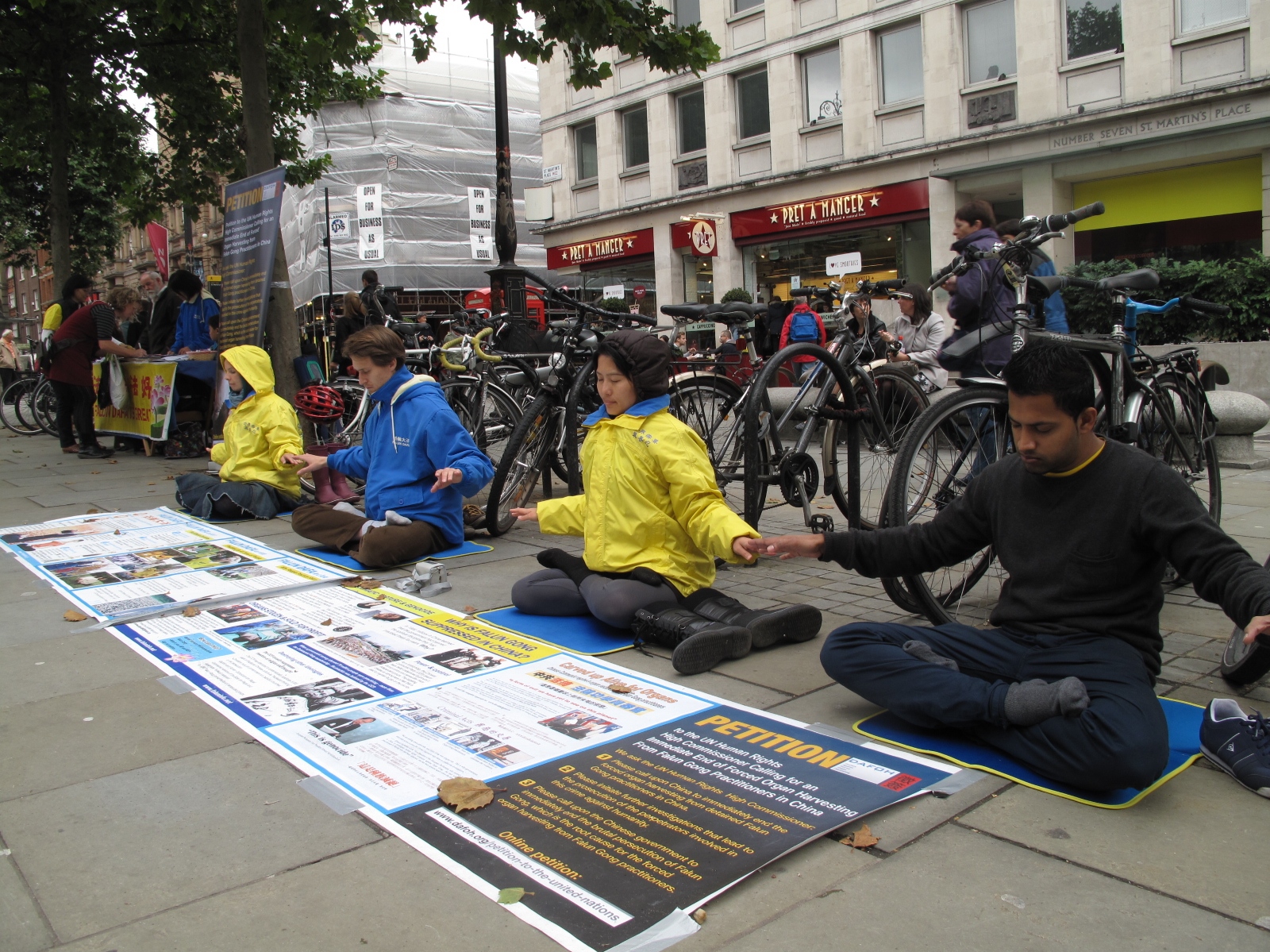 ![]() 在伦敦圣马丁广场,来自不同国家和地区的四位法轮功学员正在炼法轮功第五套功法。 |