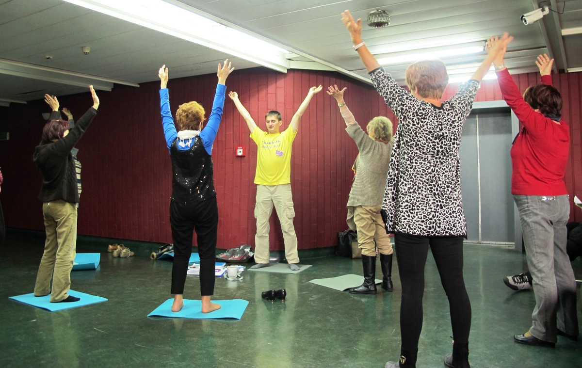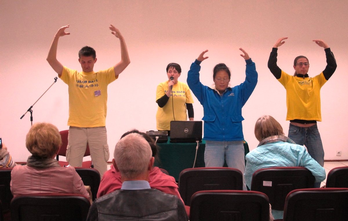 ![]() 图1:在法轮功专题报告会上,法轮功学员正在展示功法 |