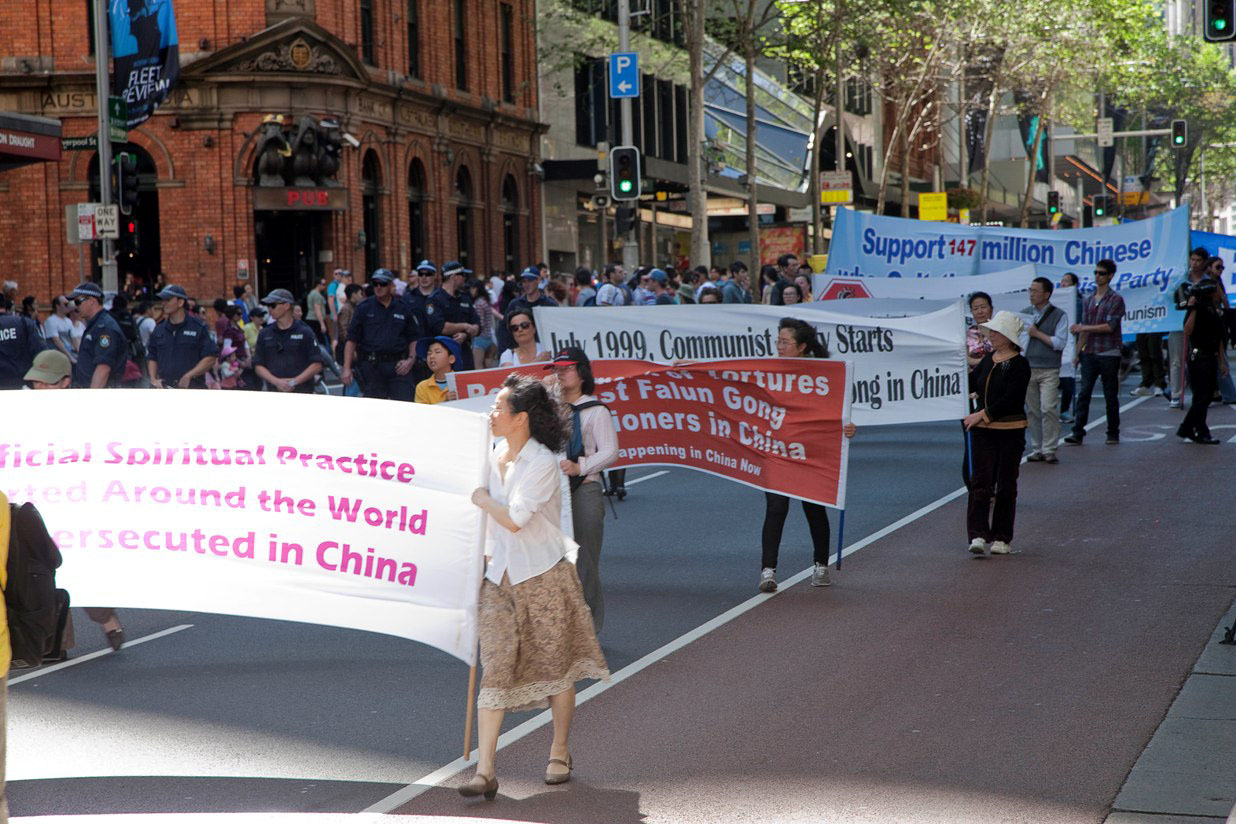 游行队伍从海德公园出发,经悉尼最繁华的几个主要街道抵达中国城。队伍中迎风招展的各种颜色展板和横幅,传达着法轮功学员的心声:“法轮大法好”、“世界需要真善忍”、“法轮大法弘传世界一百多个国家”,“停止迫害法轮功”,“停止活摘法轮功学员器官”,以及“天要灭中共,退党保平安”等。