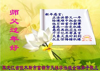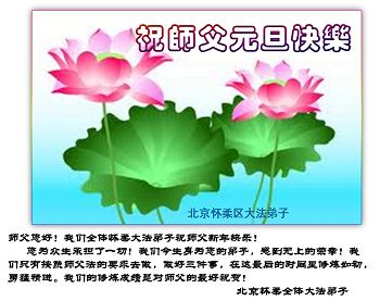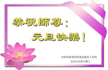 在最后的时刻,作为一名大法弟子,我还有很多事没有做好。无论如何,我坚修大法的心金刚不动,在有限的时间里我将努力找出自己的不足,修去它,克制自己,多多救人,真正让师尊少一份操劳,多一点欣慰。在这喜庆的日子里,我在远方遥祝师尊元旦快乐!