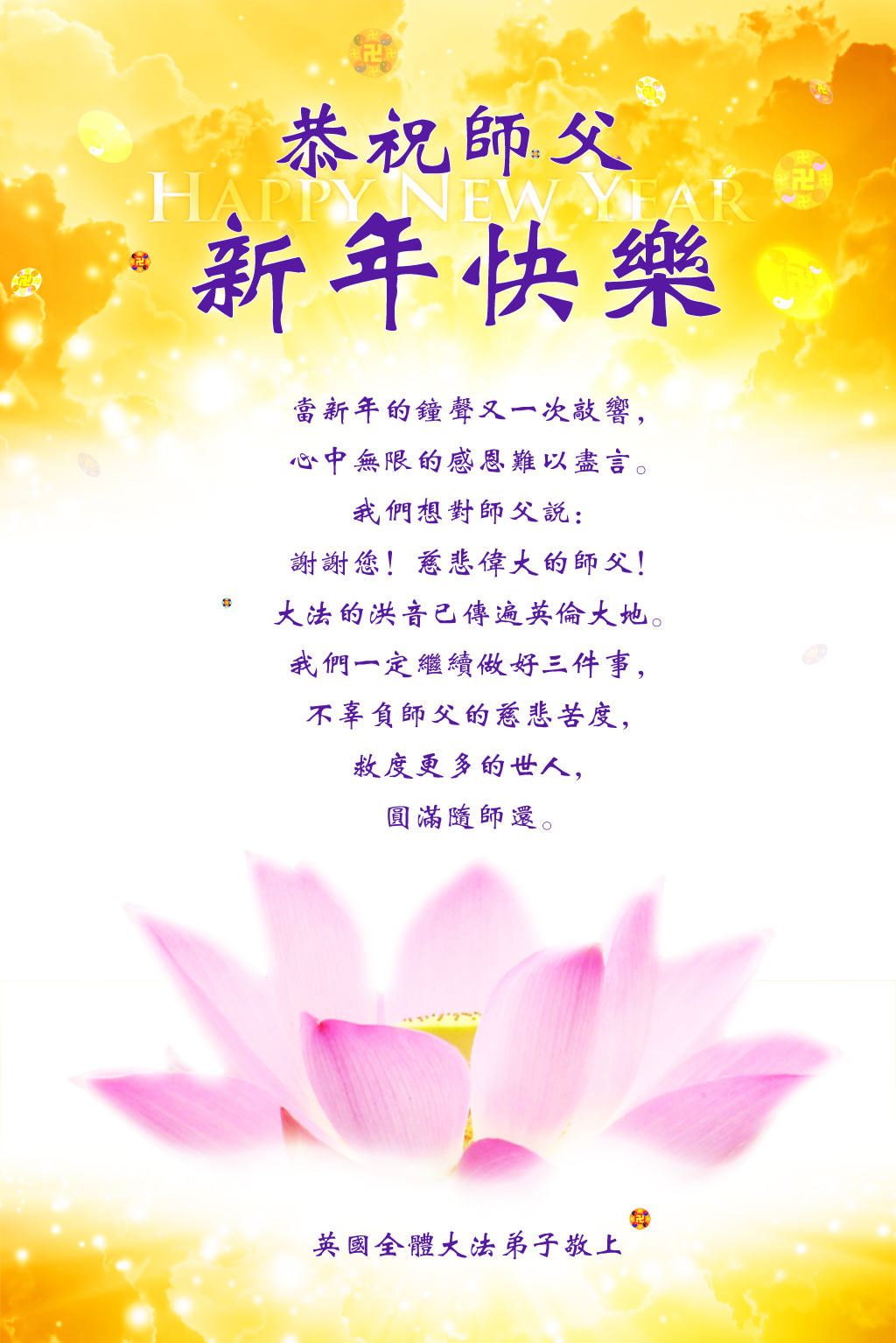 尊敬的师父:您好!在这新旧交替的时候,南非大法弟子祝您新年愉快!