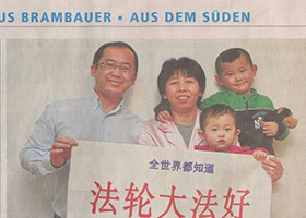 一月十三日,德国西部最大的地方报纸——《鲁尔信息日报》报道了郭居峰全家的故事,文章的标题是“他非常担心他的朋友”,报纸上这个四口之家拿的横幅上写着中国汉字:“全世界都知道法轮大法好”。