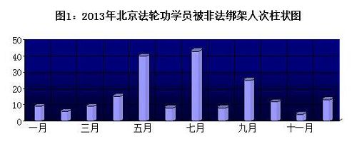 ![]() 图2:二零一三年一月至十二月北京各区县法轮功学员被绑架人数分布柱状图 |