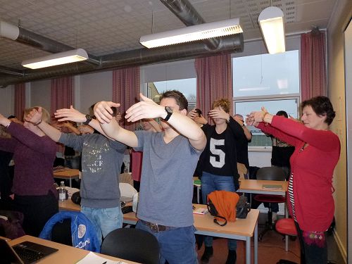 二零一四年一月二十日,在丹麦丝绸堡一所高中的课堂上,法轮功学员应邀前来给学生们介绍法轮功。学生们听得很专心,最后还兴致勃勃学习了法轮功的功法。