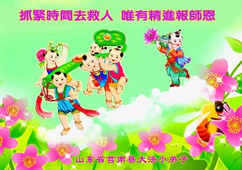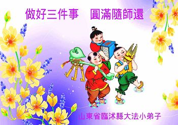 我现在虽然没有随大人修炼法轮大法,但我认识到了法轮大法的伟大,也一直沐浴在您的慈悲呵护下成长,我经常没有忘记念“法轮大法好!真善忍好!”九字吉言。
