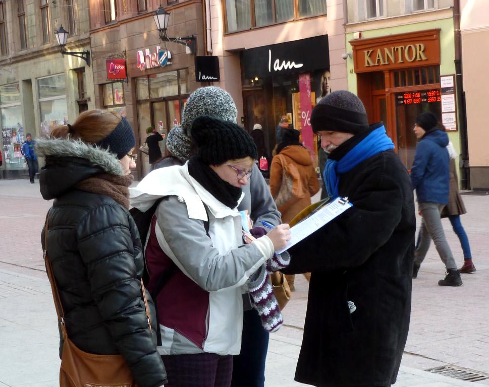【明慧网二零一四年一月二十九日】二零一四年一月二十四、二十五日波兰法轮功学员来到著名天文学家哥白尼的出生地——托伦(Torun)市征集反活摘器官签名。