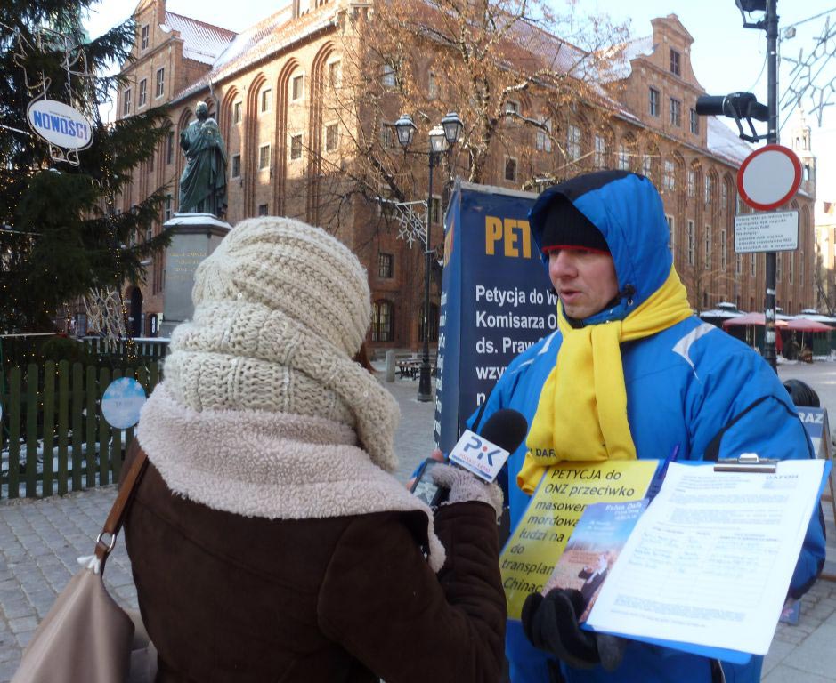 报道中说:“法轮功(法轮大法)是中国一种传统的修炼功法,可中共多年来一直在活体摘取和出卖法轮功学员的器官,并由此引出一个收入可观、利润丰厚的生意,中国有上亿人修炼法轮功,为制止这种侵犯人权的罪行,(波兰)法轮大法学会特来托伦市,在老城广场设立征签点,希望托伦市民在反对强摘器官的请愿书上签名,该请愿书将被递交给联合国人权委员会,类似托伦这样的征签活动在世界各国都有举办。”
