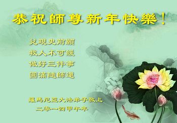 甲午年新年到来之际,请师父放心,我们一定会勇猛精進,整体提高,整体配合。整体升华,信师信法,按照大法的标准要求自己。救度众生,做师父所要求的正法时期大法弟子。
