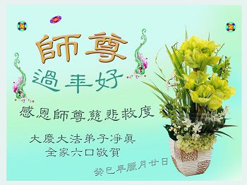 师尊对我们一家的洪恩浩荡,弟子们无以言表。在正法的最后时刻,我们只有在做好三件事的同时,同化大法,多救度众生,圆满随师还。