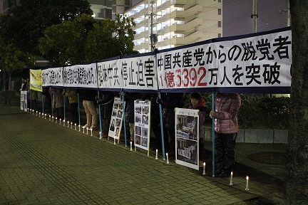 三十一日下午三点到深夜一点,福冈、佐贺、熊本等地区的部份法轮功学员牺牲自己与家人团圆的时间,分别来到长崎和福冈中领馆前,打开反迫害横幅和展板,用烛光守夜方式悼念在中国大陆被中共邪党迫害致死的无辜的法轮功学员,并呼吁制止中共对法轮功长达十四年多的残酷迫害。