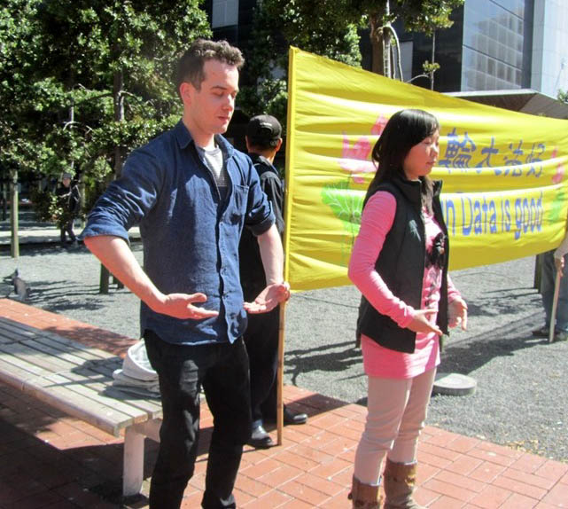 法轮功学员以功法演示拉开了这次活动的序幕。悠扬的音乐、柔和缓慢的炼功动作吸引了许多路人驻足。二十岁出头的洋人小伙子山卓(Sandro),路过时被祥和的能量场所吸引,主动加入炼功队伍,跟学员们一起炼法轮功第二套功法“法轮桩法”的第二个动作“腹前抱轮”。有法轮功学员上前帮他纠正了动作,问他为什么想学功,他回答说:“我不由自主地想来学他们的动作。我感觉这太让人轻松了。”山卓后来还学了“法轮桩法”的第三个动作“头顶抱轮”,并让他的朋友为他拍照留念。离开时,他一边走还一边对他的朋友念叨“太让人放松了”。