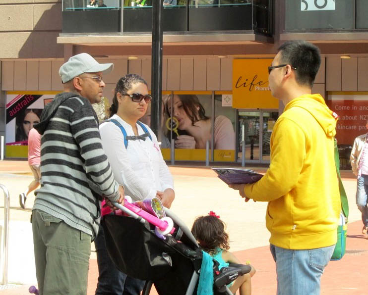 许多华人也接过真相资料并认真阅读。来自中国大陆的一位游客和法轮功学员占女士谈了许多。她说自己早就在中国了解了法轮功的真相,一直都想学功,只是在中国没有那个环境。她还谈到:“在中共治下的中国,人与人之间的关系非常紧张,毫无信任感。有毒的食品满地都是,人们活得很苦。”她说自己来到新西兰,感觉非常轻松快乐。离开前,她办理了“三退”手续。