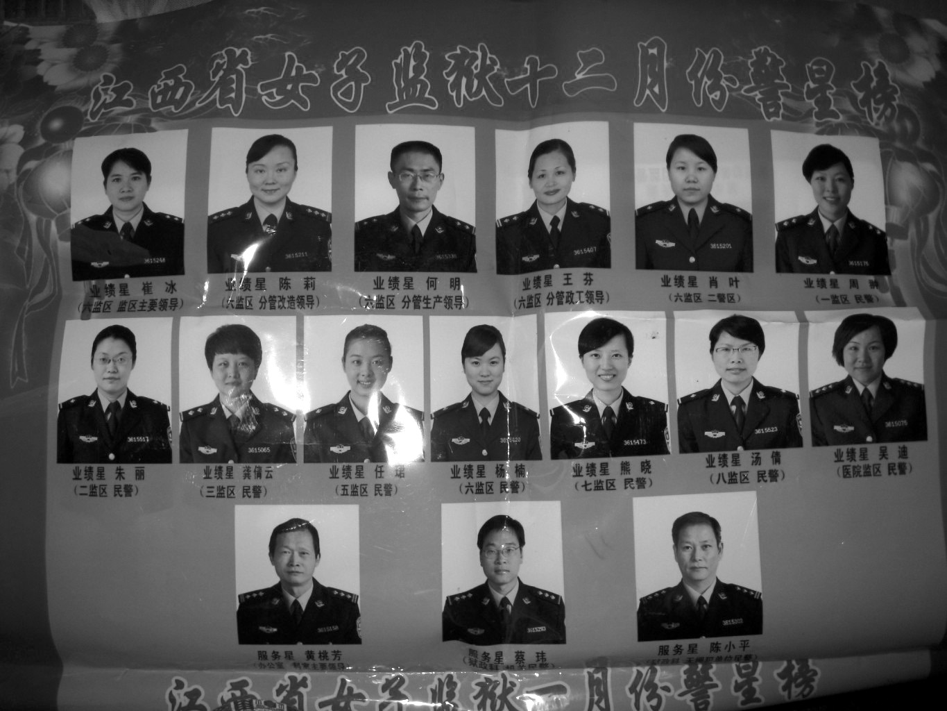 此处提供的照片系翻拍自从江西省女子监狱得到的十二月、一月的所谓“警星榜”,每月计16人,但肖叶、汤倩各出现了两次,所以共计30人。因原件为光面材质,易反光,所以拍摄效果不太理想。