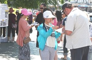 二零一四年十月十二日,部份悉尼法轮功学员在华人聚集繁华区之一的艾士菲摆放图片,揭露中共对法轮功的迫害,并声援一亿八千万民众退出中共邪党及其团队组织,数十位中国人当场做了“三退”。