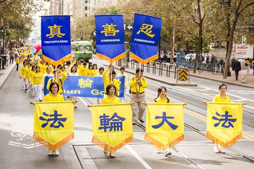 【明慧网二零一四年十月十六日】(明慧记者章韵美国旧金山报道)二零一四年十月十五日星期三,美国西部法轮大法修炼心得交流会前夕,来自世界各地的法轮功学员汇集在美国旧金山的金融区、市中心和唐人街举行炼功、游行与集会。他们向旧金山的上班族、金融界人士和华人展示大法的美好,揭露中共十五年来对法轮功学员的残酷迫害,赢得民众的正义支持。