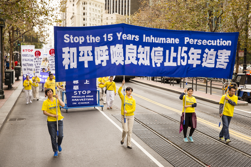 【明慧网二零一四年十月十六日】(明慧记者王英旧金山报道)二零一四年十月十五日,近两千名法轮功学员在美国旧金山市府前广场和位于金融区的苏•比尔曼公园(Sue Bierman Park)举行炼功、游行和集会,呼唤良心,解体迫害。