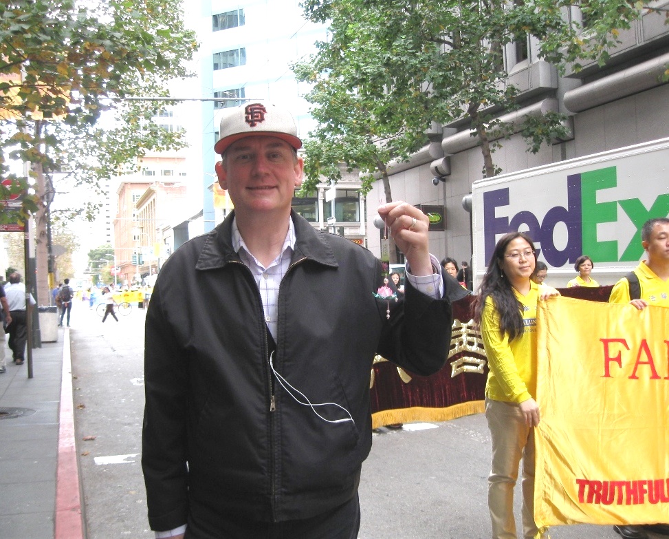 爱尔兰族裔的Philip Pierce 在San Francisco Business Times工作,他认真地拍着每一张照片,他说:“可以用几个字来形容这个游行:雄伟、壮观和美好。我支持他们的反迫害,迫害应该马上停止!”