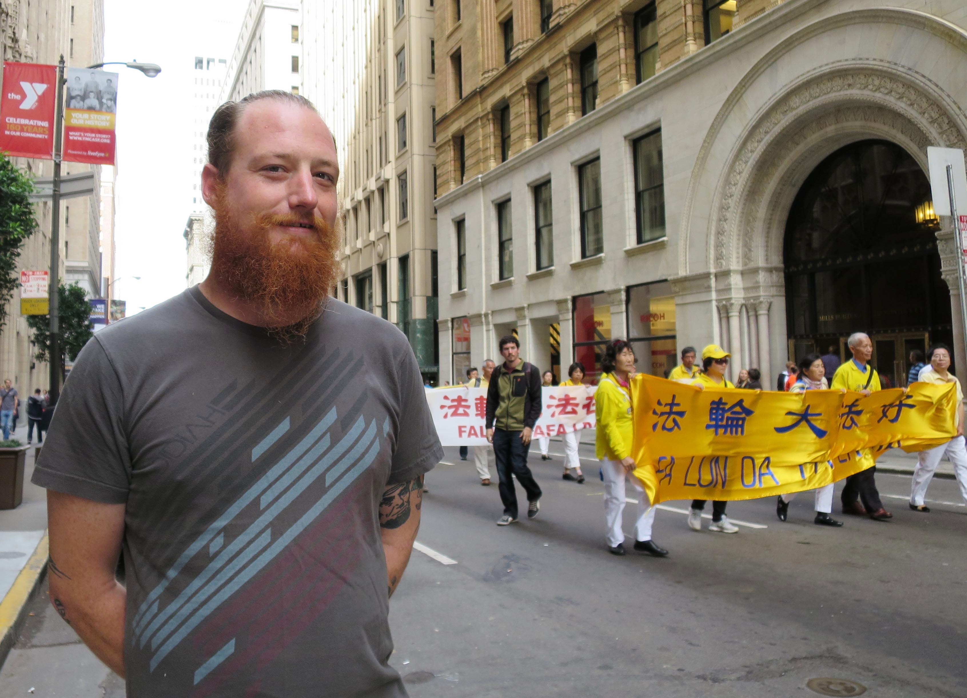 佩戴着“Wells Fargo”徽章的Brian Smith中午吃饭时间很认真地观看着游行,他基本把整个过程都看了。他告诉记者说,他以前听说过法轮功,但不是很清楚,今天看到了整个游行后,他明白了很多。他说:“世界需要更多的和平和关爱,我看到了这是一群非常好、非常祥和的人。我也看懂了在中国发生的事情。”