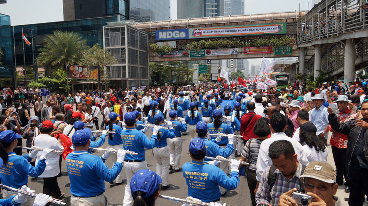【明慧网二零一四年十月二十二日】二零一四年十月二十日,印尼新一任总统佐科威和副总统卡拉的就职典礼游行在市中心苏迪曼大街、塔林大街、国家纪念碑和总统官邸一带举行,参加者数以万计。在游行的前几天,印尼法轮功学员向举办方介绍了法轮大法,之后便收到了一份热情洋溢的邀请信,举办方分别给腰鼓队和天国乐团提供了两个地方参加游行。