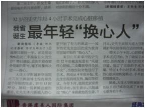 2. 2006年8月4,新华医院在它的官方网站上登出《我省最年轻的“换心人”获得新生》的报道,在大连《新商报》也同样刊登了这条消息。32岁的史某来自山东新泰市。2006年5月,他来到了北京安贞医院,经检查诊断“机械瓣周漏、二三尖瓣关闭不全、全心大、全心衰、肺动脉高压” 预期寿命不到1年,只能通过“换心”来挽救他的生命。7月末,史先生来到新华医院等待合适的供体。8月3日大连大学附属新华医院心脏外科主任解强为他完成心脏移植手术。从7月末到8月3日,大约10天左右就找到合适供体。等待心脏供体时间为10天。