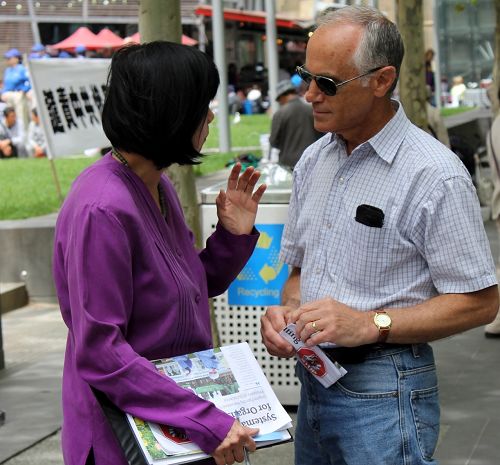 墨尔本市民多米尼克(Michael Dominick)先生非常支持法轮功,他说:“大约在两年前,我拿到一份法轮功真相报纸,内容让我感到很震惊,于是我就开始在网上搜索研究这方面的内容,发现报纸上说的都是真的。从那以后,我时常和朋友们谈论这件事情,给他们《九评共产党》光碟或册子,还有报纸,告诉他们真相。中国共产党一直在压迫人 民,不给人民任何宗教信仰自由,没有任何媒体自由,一切都在监控或审查之下,这真是太荒谬了,我们需要尽快制止这些恶行。”